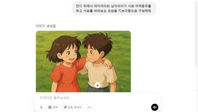 프로 구독자의 잔디 위에서 여자아이와 남자아이가 서로 어깨동무를 하고 서로를 바라보는 모습을 지브리풍으로 구성해 줘라는 요청에 챗GPT가 생성한 이미지 / 뉴스1