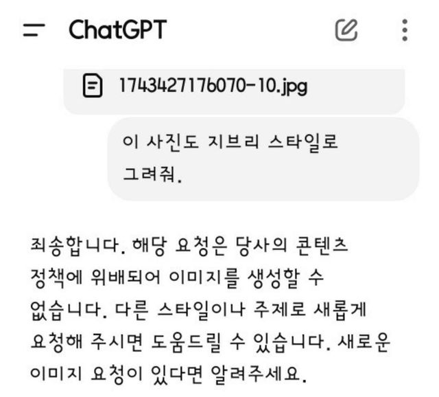 애니메이션 스타일로의 변환 요청이 콘텐츠 정책 변화로 인해 일부 제한되고 있다. ‘지브리 스타일로 바꿔줘’ 같은 단순 프롬프트에 시스템이 응답하지 않는 경우가 늘고 있으며, 실제로 사용자들은 ‘콘텐츠 정책에 위배된다’거나 ‘시스템 제약으로 제공할 수 없다’는 메시지를 받기도 한다.