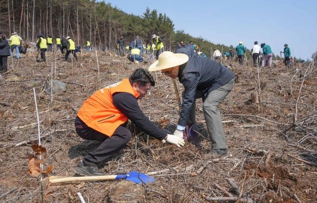 이날 행사에는 김기웅 군수를 비롯해 관내 기관·단체, 지역주민 등 약 300여명이 참여했으며, 총 2.3ha의 면적에 상수리나무 6900본을 식재하며 나무심기의 중요성과 산림의 소중함을 되새겼다.