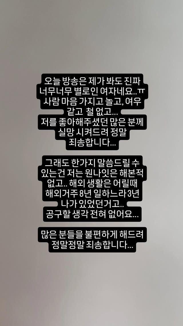 이어 "그래도 한가지 말씀드릴 수 있는 건 저는 원나잇은 해본 적 없고 해외 생활은 어릴 때 해외 거주 8년, 일하느라 3년 나가 있었던 거고 공구할 생각이 전혀 없어요... 많은 분들을 불편하게 해드려 정말 정말 죄송합니다"라며 거듭 사과했다.