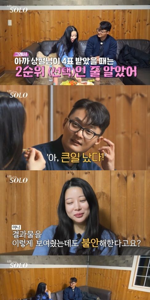 영식은 미경에게 "상철님이 4표 받을 때 초긴장, 2표 받을 때까지는 대단하다인데 세 번째부터는 웃음이 나오더라. 4표 받았을 때는 2순위인 줄 알았다. 아 큰일났다 싶었다"라며 속마음을 이야기했다.