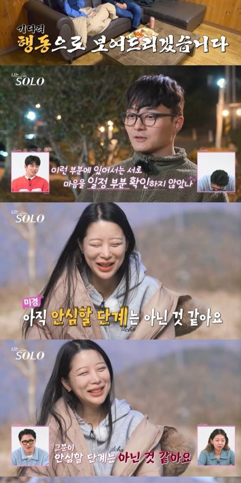 미경은 제작진과의 인터뷰에서 "내 마음이 아직 안심할 단계는 아닌 것 같다. 그분이 안심할 단게는 아닌 것 같다. 아직 다른 분도 더 알아보고 싶다. 되게 미안하다. 이 사람에게 안심도 주고 싶지만 그렇다고 너무 안심시키고 싶지 않다. 못 됐죠?"라며 웃었다.