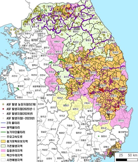 한편 야생멧돼지 아프리카돼지열병은 2019년 10월 경기도 연천에서 처음 발생한 이후 경기, 강원, 경북 등 6개 시도 43개 시군으로 확산되다가 지난해(2024년) 6월 군위군을 끝으로 정체 중이다.