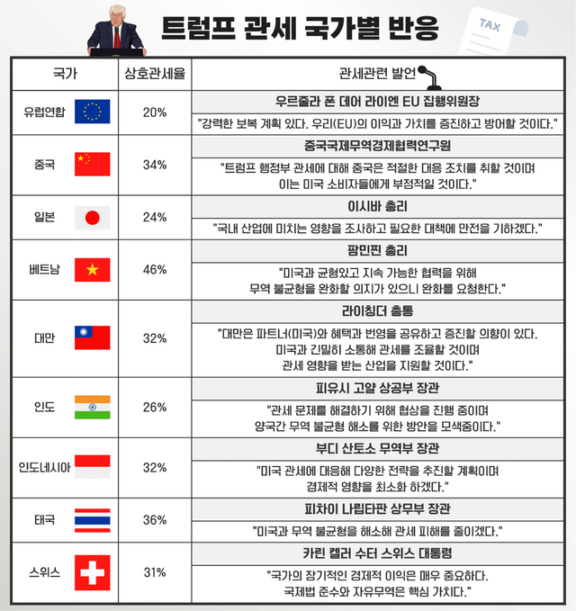 상호 관세에 대한 각국 입장은 각각 다르다. 온건파는 불평등 무역 균형을 맞춰 트럼프 대통령과 재협상을 시도하겠다는 입장인 반면 강경파 측에서는 트럼프 대통령의 관세를 비판하며 대응하겠다는 의지를 표명하고 있다.