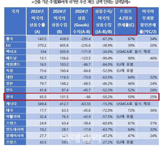 국금센터 분석 결과, 미국이 발표한 미국에 대한 국가별 관세율은 실제 관세율이 아니라 작년 미국의 국가별 상품수입을 분모로 미국의 상품수지를 분자에 넣고 산출된 숫자와 같았다.