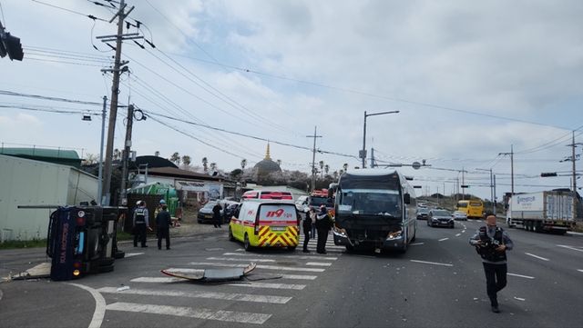 3일 제주도소방안전본부에 따르면 이날 낮 12시10분쯤 제주시 조천읍의 한 도로에서 트럭이 관광버스와 부딪힌 뒤 전복됐다. <사진>