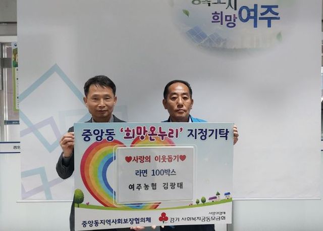 [와이뉴스] 지난 2일 중앙동행정복지센터에서는 뜻깊은 기부가 이루어졌다. 여주시 하동 소재의 농협 직원 김광태씨가 중앙동행정복지센터에 라면 2000개를 기탁했다.