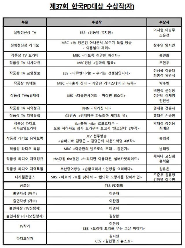 제37회 한국PD대상 수상 결과. / 한국PD연합회 제공