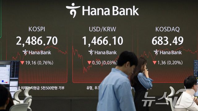 도널드 트럼프 미국 대통령이 한국에 25%의 상호관세를 부과하겠다고 발표한 3일 서울 중구 하나은행 본점 딜링룸 전광판에 종가 현황이 표시돼 있다. 이날 코스피 지수는 전 거래일 대비 19.16p(0.76%) 하락한 2,486.70, 코스닥 지수는 1.36p(0.20%) 하락한 683.49로 장을 마감했다. /사진=뉴스1