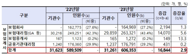 대형 GA 수 자체도 증가했다. 대형 GA는 전년 동기 대비 70개사에서 74개사로 4개사가 늘었다. 소속설계사도 20만172명에서 22만7896명으로 2만7724명이 늘었다.