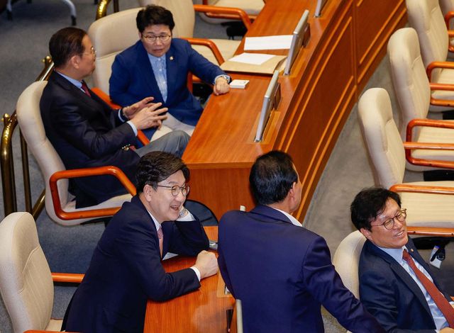 국민의힘의 권영세 비대위원장, 권성동 원내대표가 3일 오후 서울 여의도 국회 본회의장에서 열린 경북·경남·울산지역 산불 사태 수습과 피해대책 마련 및 헌법질서 수호를 위한 긴급현안질문 중 각각 동료 의원들과 대화하고 있다. / 뉴스1