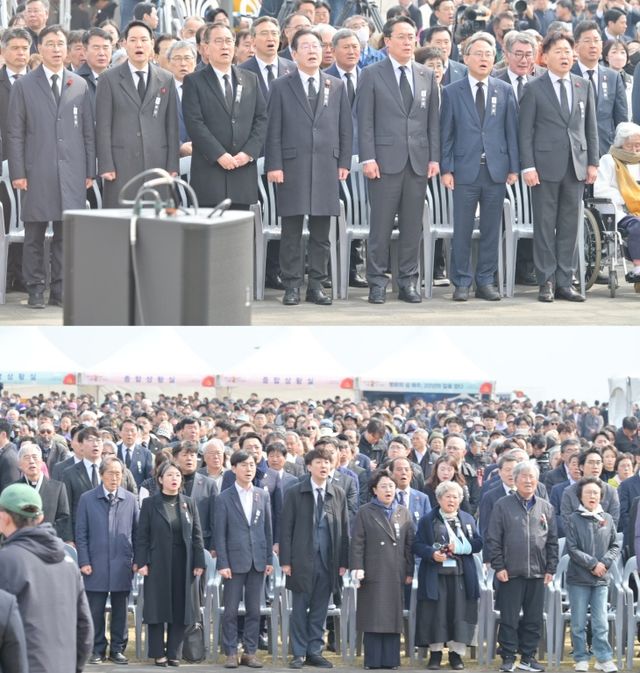 이날 국민의힘 중앙당 인사 중 유일하게 참석한 최형두 의원은 "당 대표가 없는 비상체제여서 부득이 혼자 대신해서 왔다"며 "국민의 비극을 승화시켜 제주를 다시 한번 통합의 섬으로 이끌어 나가도록 최선을 다하겠다"고 말했다.