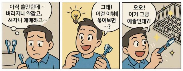 칫솔은 버릴 땐 플라스틱 쓰레기지만, 활용하기 나름에 따라 유용한 생활 도구로 바뀔 수 있다. 지금 바로 욕실 서랍에 방치된 칫솔 두 개만 꺼내 고무줄로 묶어보자. 짜증 나던 식기건조대 청소가, 놀랍도록 간편한 일로 바뀌는 경험을 하게 될지도 모른다.