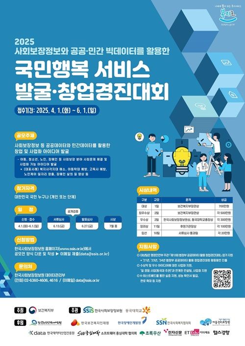 한국사회보장정보원이 동국대학교와 함께 2025년 사회보장정보와 공공·민간 빅데이터를 활용한 ‘국민행복 서비스 발굴·창업 경진대회’를 개최한다고 밝혔다.