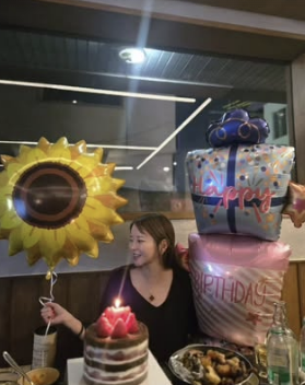 사진 속 박지연은 해바라기와 선물 모양 풍선을 손에 들고 생일 케이크 앞에서 행복한 표정을 짓고 있다.