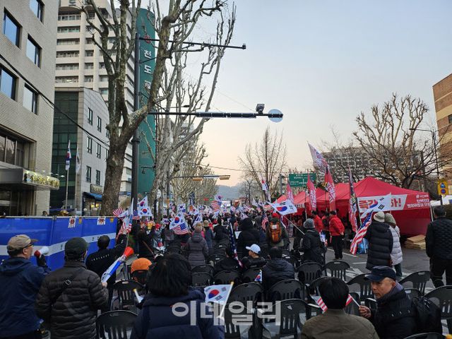 같은날 안국역 인근 수운회관에는 집회 반대를 주장하는 이들이 이른 시간부터 집회를 이어가고 있었다. 초반에는 고령자 중심이였지만 퇴근 시간이 다가올수록 정장 차림의 젊은 직장인이나 가족 단위로 집회를 나온 이들이 많아졌다. 이들은 태극기와 성조기를 들고 ‘탄핵 기각’이 적힌 손팻말을 흔들며 구호를 외치고 있었다.