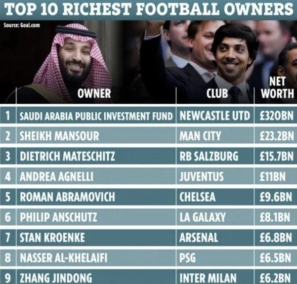 지난해 영국 매체 '더선'은 "뉴캐슬의 실질적인 구단주 무함마드 빈 살만 사우디 왕세자의 자산은 3200억 파운드(약 572조원)다. 맨시티 구단주 만수르의 자산(약 35조원) 10배가 넘는다"라고 알렸다. 카타르 투자청이 굴리는 돈의 규모보다 5배 이상 많다.