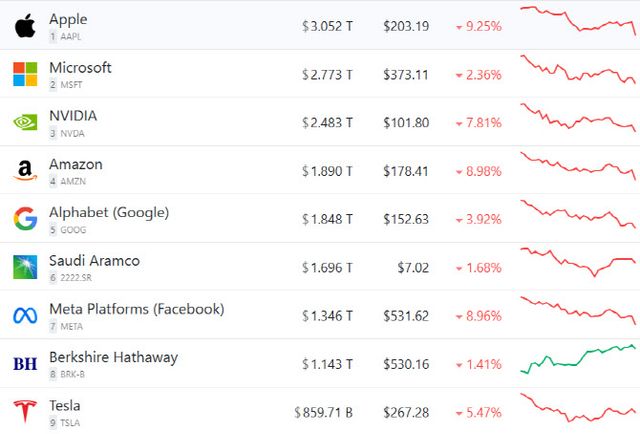 매그니피센트7 모두 일제히 급락했다. 아시아 생산 비중이 큰 애플의 주가는 9.25% 급락했고, 아마존 역시 8.98% 떨어졌다. 메타(-8.96%), 테슬라(-5.47%), 알파벳(-3.92%), 마이크로소프트(-2.36%)도 관세 여파를 피해가지 못했다.