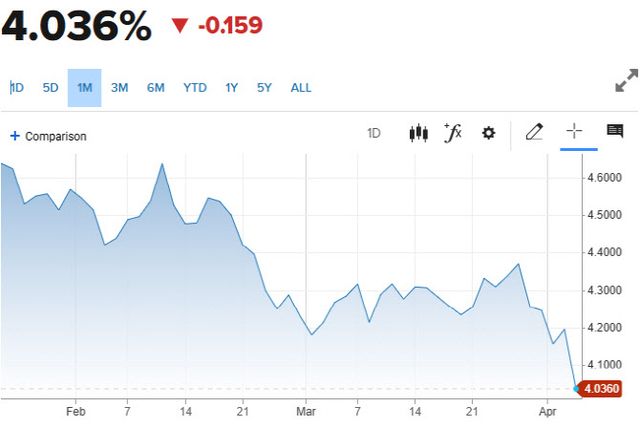 미국 경기침체 우려와 함께 안전자산 쏠림 현상으로 국채금리도 급락 중이다. 오후 4시기준 글로벌 국채벤치마크인 10년물 금리는 15.9bp(1bp=0.01%포인트)나 빠진 4.036%까지 내려갔다. 연준 정책에 민감하게 연동하는 2년물 금리 역시 20bp 떨어지며 3.704%에서 움직이고 있다.