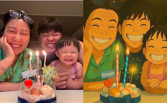 공개된 사진 속 김영희와 10살 연하 남편인 야구선수 출신 윤승열, 이들의 딸이 담겨있다. 김영희는 최근 SNS에서 유행 중인 ‘챗GPT AI 이미지를 활용한 모습. 지브리 만화 속 캐릭터 같은 사진이 눈길을 끄는 가운데, 김영희만 다소 나이 들어 보이게 표현돼 웃음을 자아낸다.