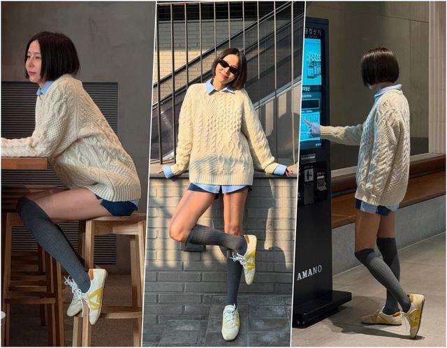 사진 속 김나영은 하늘색 셔츠와 오트밀 색상의 니트를 입은 뒤 짧은 팬츠를 매치해 하의 실종 패션을 완성했다. 그는 여기에 니삭스까지 착용, 신발을 강조하는 패션을 통해 탄탄하면서도 늘씬한 각선미를 자랑해 눈길을 끌었다.