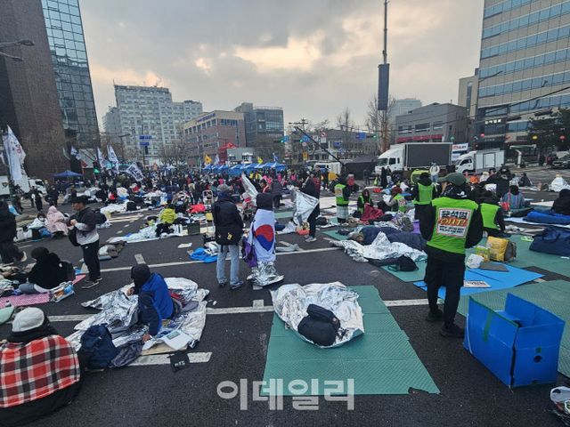 반면 탄핵 찬성 단체 집회가 열리고 있는 광화문 동십자각 인근은 축제 분위기였다. 각종 노래에 맞춰 응원봉과 손팻말을 흔들었고 ‘탄핵 인용’을 외치기도 했다. 롱패딩에 담요로 밤샘 추위를 이겨낸 안현주(25)씨는 “탄핵을 원하는 사람이 이렇게 많다는 것을 보여주고 싶었다”며 “조금 있으면 선고가 나오는데 빨리 인용돼 경제가 회복됐으면 좋겠다”고 웃음을 보였다.