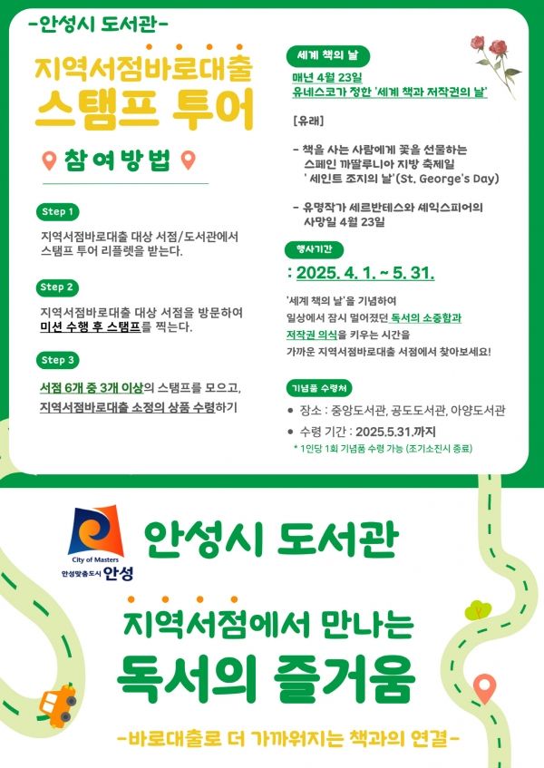 안성시 도서관은 ‘지역서점 바로대출제’ 사업 홍보의 일환으로 ‘지역서점에서 만나는 독서의 즐거움 - 지역서점바로대출 스탬프 투어’를 운영한다. 이번 프로그램은 오는 5월 31일까지 지역 내 서점 6개소에서 진행된다.