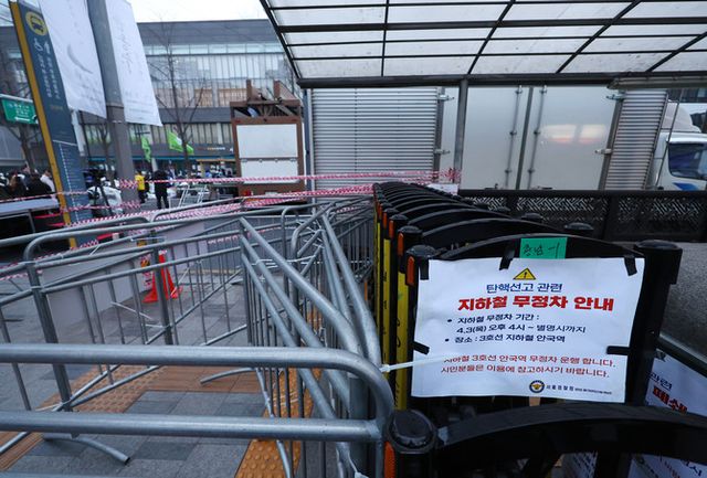 윤석열 대통령 탄핵심판일인 4일 폐쇄된 서울 지하철 3호선 안국역 입구. ⓒ 연합뉴스