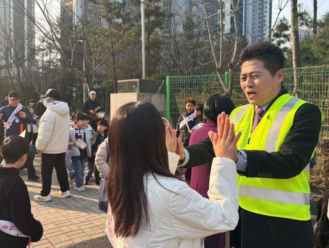 이날 김정헌 중구청장은 학교장, 교직원, 학부모들과 함께 등굣길 보행 지도 활동을 전개했다.