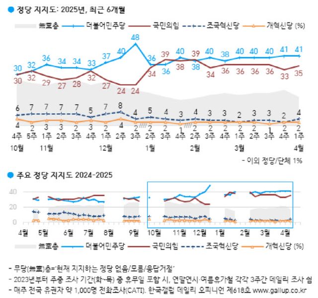 4일 한국갤럽이 지난 1~3일(4월1주) 전국 만 18세 이상 성인 1001명을 대상으로 조사한 결과, 민주당 정당 지지도는 41%로 국민의힘(35%)에 6%포인트 앞선 것으로 나타났다. 민주당 정당 지지도는 전주(3월4주)와 동일했다.