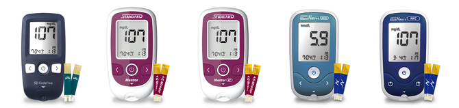 에스디바이오센서 개인용 혈당측정기 제품 5종 사진. (왼쪽부터) 에스디 코드프리, 스탠다드 멘토, 스탠다드 멘토 비티, 스탠다드 글루코나비 지디에이치, 스탠다드 글루코나비 엔에프시. ⓒ 에스디바이오센서