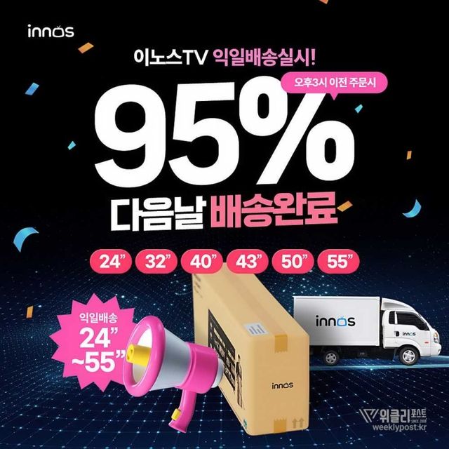 이노스TV가 24~55인치 TV 제품에 대해 전국 익일 배송 서비스를 시작한다. 오후 3시 이전 주문 시 다음 날 바로 제품을 받아볼 수 있는 서비스는 소비자 편의성과 만족도를 높이기 위한 배송 시스템 개선의 일환으로 도입됐다.