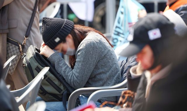 헌법재판소의 윤석열 전 대통령 탄핵 인용이 발표된 4일 한 지지자가 고개를 숙이고 있다. / 연합뉴스