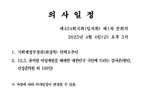 국회 의사일정에 따르면 이날 오후 3시 본회의가 열리며, 최 부총리 탄핵소추안 표결이 예정돼 있다. 이어 ‘윤석열 비상계엄을 해제한 대한민국 국민께 드리는 감사문’(진성준 의원 외 169인 발의)도 처리될 계획이다.