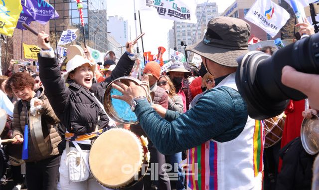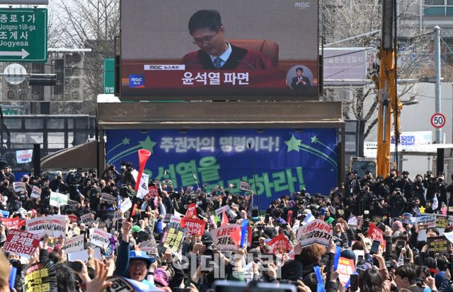 헌법재판소의 주문이 내려지자 광화문 동십자각 인근의 탄핵 찬성 집회에서는 일제히 큰 함성이 쏟아졌다. 시민들은 노래에 맞춰 춤을 추며 함박웃음을 지으며 환호를 이어갔다. 일부 참석자는 만세를 부르며 기쁨의 눈물을 보이기도 했다.