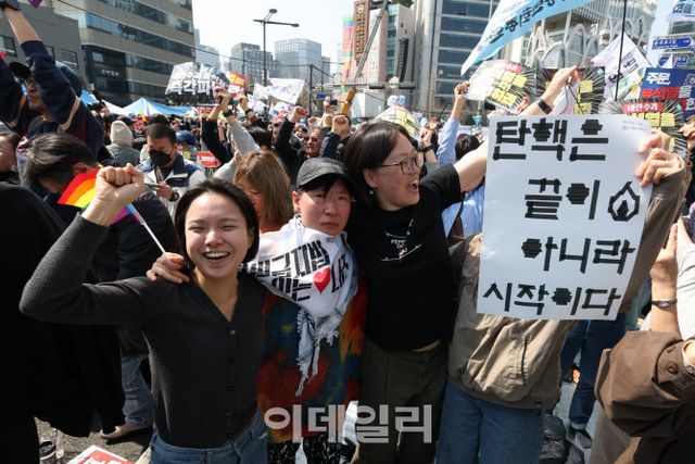| [이데일리 이영훈 기자] 윤석열 대통령 탄핵심판 선고일인 4일 서울 종로구 안국동사거리 일대에서 윤석열 대통령 탄핵이 인용되자 환호하고 있다. |