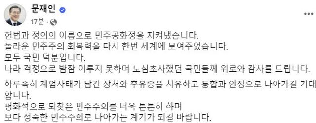 문 전 대통령은 이날 자신의 페이스북에 “헌법과 정의의 이름으로 민주공화정을 지켜냈다. 놀라운 민주주의 회복력을 다시 한번 세계에 보여주었다”며 이같이 밝혔다.