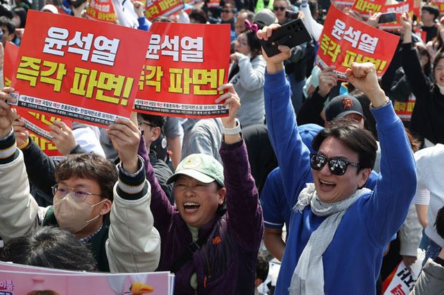 윤 대톨령의 파면 선고에 탄핵 찬성 지지자들이 환호하고 있다. ⓒ 연합뉴스
