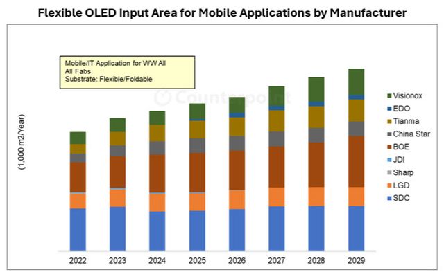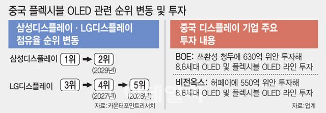 4일 시장조사기관 카운터포인트리서치에 따르면 중국 최대 디스플레이 기업 BOE는 오는 2029년 플렉시블 OLED 시장에서 생산기준 점유율 1위를 기록할 것으로 추정된다. 현재 1위인 삼성디스플레이가 2028년까지 자리를 지키다가 중국 기업에 내주는 것이다.