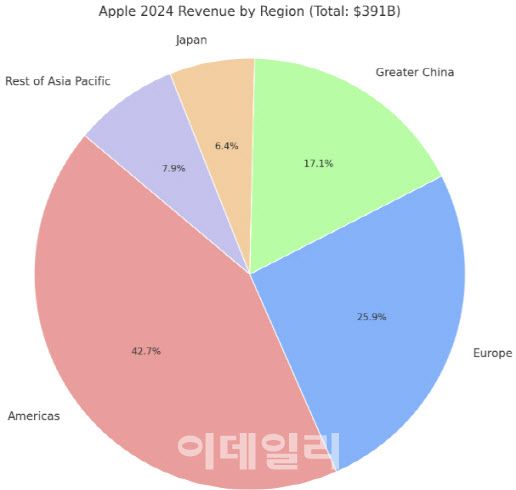 문제는 소비자 가격이 상승이 판매량 부진으로 이어질 수 있어서다. 북미는 애플의 텃밭으로 2024년 기준 전체 매출의 43% 비중을 차지한다. 2024년 총 매출 3910억 달러(562조원) 중 약 1670억 달러(240조원)가 북미에서 발생했다.