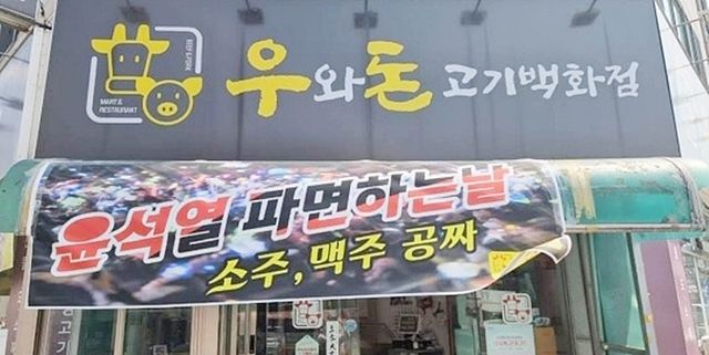 이날 광주 광산구 월곡동에 있는 우와돈고기백화점도 '윤석열 파면하는 날 소주·맥주 공짜'라고 적힌 현수막을 내걸고 영업 준비에 나섰다. 매일 오후 4시 30분에 문을 여는 해당 음식점은 이날 저녁 손님들에게 주류를 무료로 제공할 예정인 것으로 전해졌다.