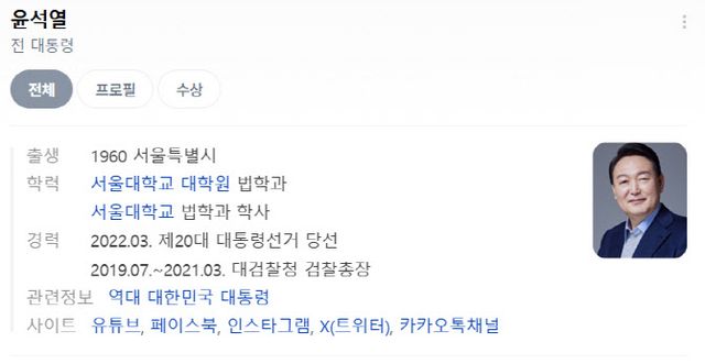 각 포털사이트 메인 검색창에 ‘윤석열’라는 단어를 입력하면 인물 정보 이름에 ‘전 대통령’이라는 호칭이 작은 글자로 표시된다. 김건희 여사 역시 ‘전 영부인’이라는 호칭으로 바뀌었다.