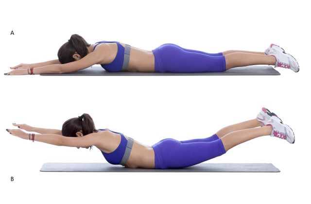 ·상체와 하체를 동시에 들어 올리며, 팔과 다리를 하늘로 향하게 만든다. 이때 척추를 길게 늘려주는 느낌으로 동작을 수행한다. 3초간 유지한 후 천천히 원위치로 돌아온다.