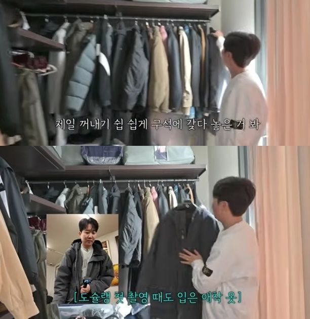 또 "간절기용 외투인데 얘도 안 입고 얘도 안 입고 얘도 안 입는다. 얘는 약간 입었다. 특징이 뭐냐면 내가 산 건 안 입고 회장님이 옷 쇼핑할 때 기사처럼 따라가다가 하나씩 얻어서 산 거다"라며 입는 옷만 입는 습관을 고백했다.
