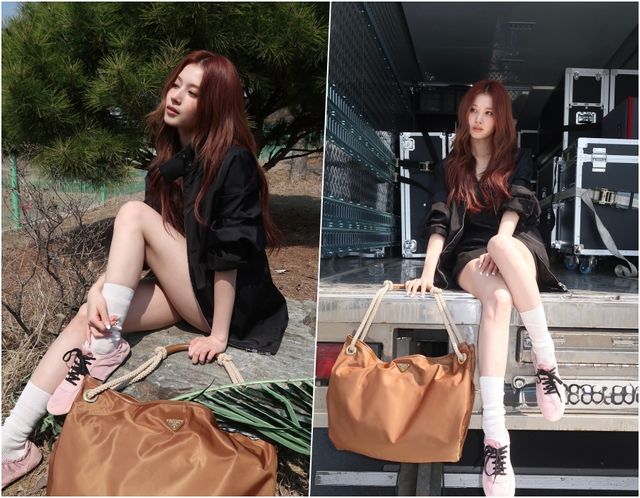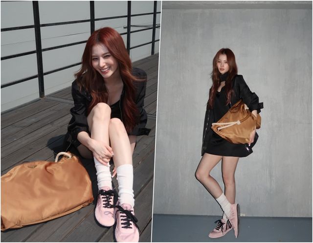 사진 속 사나는 프라다 풀착장을 완성한 모습이다. 특히 그는 블랙 색상의 미니 원피스와 재킷을 입고 있는 모습으로 시크한 아우라를 발산하면서도, 핑크색 스니커즈를 매치해 화사한 분위기도 자아냈다.
