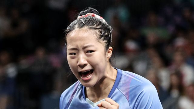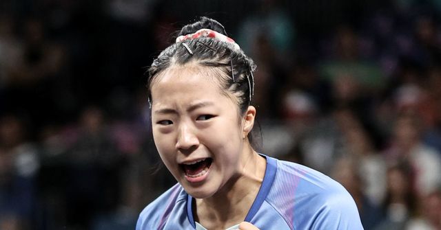 대한민국 탁구 대표팀 신유빈이 지난해 8월 2일(한국 시각) 프랑스 파리 사우스 파리 아레나 4에서 열린 '2024 파리올림픽' 탁구 여자 단식 준결승 중국 첸멍 선수와의 경기에서 득점한 후 기뻐하고 있다. / 뉴스1