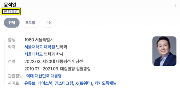 이러한 신속한 정보 변경은 윤 전 대통령의 파면 효력이 선고 즉시 발생함에 따라 각종 정보 시스템이 이에 맞춰 빠르게 대응한 것으로 해석된다. 실제로 ‘윤석열’을 검색하면 ‘전 대통령’이라는 직함으로 바뀐 것을 확인할 수 있으며, 관련 뉴스와 정보도 ‘전직 대통령’으로서의 상황에 초점을 맞추고 있다.