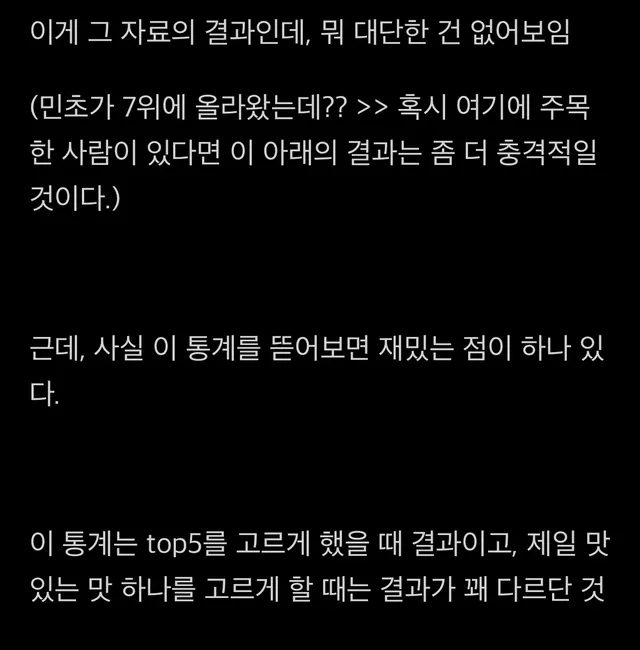 7위에 있던 민초가 최애맛 고르기로 바꾸니 갑자기 3위로 올라온 것을 볼 수 있다