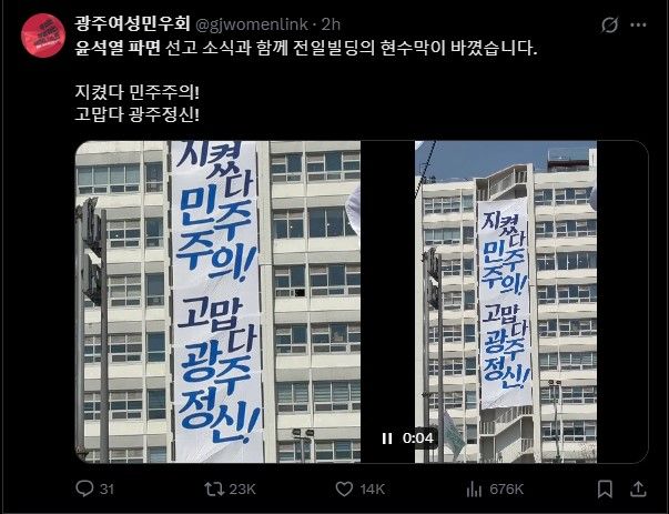 '광주여성민우회' 계정에서는 "윤석열 파면 선고로 전일빌딩 현수막이 바뀌었다"며 '지켰다 민주주의! 고맙다 광주 정신!' 현수막이 걸린 전일빌딩 사진을 올렸다. 광주 금남로에 위치한 전일빌딩은 1980년 5월 광주 사태 당시 계엄군의 헬기 사격 흔적이 남아있는 곳으로, 역사적 가치를 인정받아 사적지로 지정·보존하고 있다.