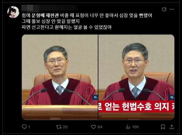 엑스에는 '파면' 주문을 선고한 '문형배 재판관'이라는 카테고리도 등장했다. 한 이용자는 "(선고) 처음에 (카메라가) 문 재판관 비출 때 표정이 너무 안 좋아서 심장 멎을 뻔했다"며 파면 선고 전후 중계 이미지를 첨부했다. 그러면서 "'파면' 선고하고 환해진 얼굴 표정"이라고 썼다.